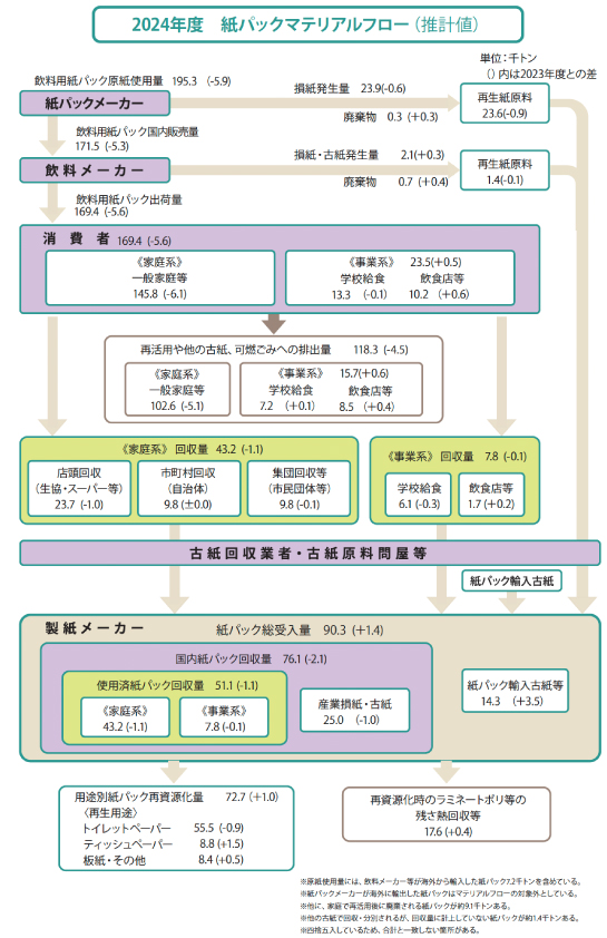 - 2024年度の飲料用紙パック原紙使用量は195.3千トンで、前年度から5.9千トン減少しました。また、飲料メーカーを通して国内市場に出荷された飲料用紙パックは169.4千トンで、5.6千トン減少しました。出荷量の内訳は、一般家庭等に向けた家庭系が145.8千トン、学校給食や飲食店等に向けた事業系が23.5千トンでした。