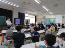 出前授業はクラスごとに2時限目、3時限目の授業として組み込まれ、3R推進プロジェクトが「学校給食用牛乳パックのリサイクル」「他校での取り組み事例紹介」を、容環協が「牛乳パックのリサイクルにかかわる事業者の取り組み」を、川崎市環境局が「川崎市のごみ減量の取り組みと牛乳パック」を担当しました。川崎市の市民団体からは地球温暖化や脱炭素、SDGsの内容が、容環協からは川崎市の牛乳パックリサイクルの現状やリサイクルすることによる環境保護や社会貢献についての内容が、川崎市環境局からは川崎市は環境先進都市として市民の意識が高く、ごみの排出量が年々減っているとの内容が紹介され、児童たちは真剣に聞いていました。 -