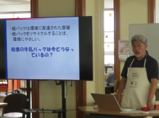 次に容環協では牛乳パックンを使った啓発動画を見せ、続いて講義を行いました。講義では、給食の牛乳パックは今のところほとんど焼却されているが、川崎市には学乳パックをリサイクルするためのインフラ(古紙問屋のネットワークや、紙パックを原料として使う家庭紙メーカーの工場)が揃い、市民の環境意識も高いことを説明しました。そして、どうすれば給食の紙パックが資源としてリサイクルできるか、考えようと呼びかけました。